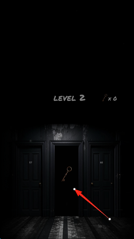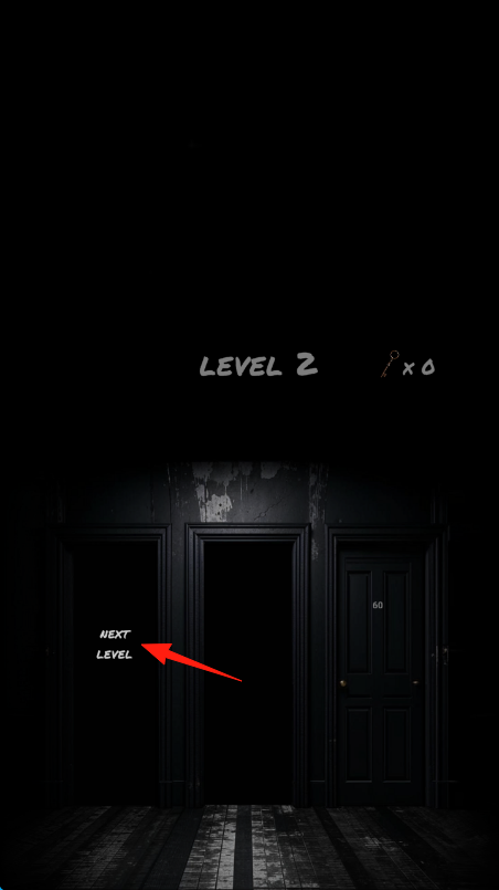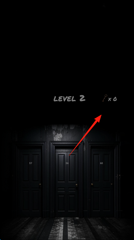 1、進(jìn)入LEVEL2,場(chǎng)景有3扇門,紅箭頭指鑰匙,探索房間,找鑰匙、線索,點(diǎn)擊門嘗試互動(dòng)。