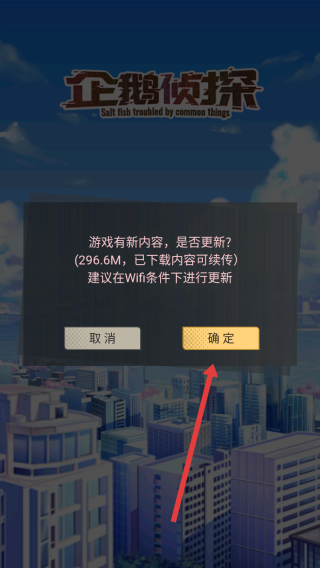 1、企鵝偵探彈出更新提示,點擊黃色確定按鈕,建議在WiFi環(huán)境下更新296.6M新內容,已下載內容可續(xù)傳。