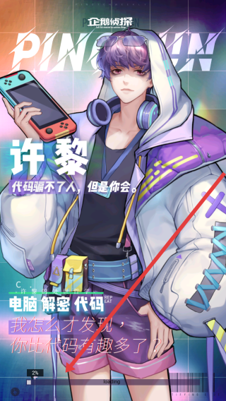2、進入游戲角色界面,查看角色許黎的形象與設定,界面展示其電腦、解密、代碼關聯(lián)標簽及臺詞,了解角色背景。