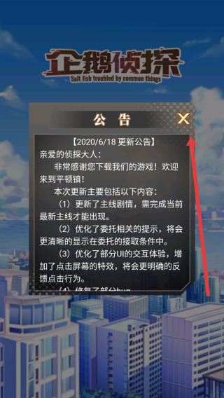 3、更新公告2020/6/18顯示新增主線、優(yōu)化委托提示等內容,閱讀后點擊右上角×關閉公告,體驗更新后的游戲。