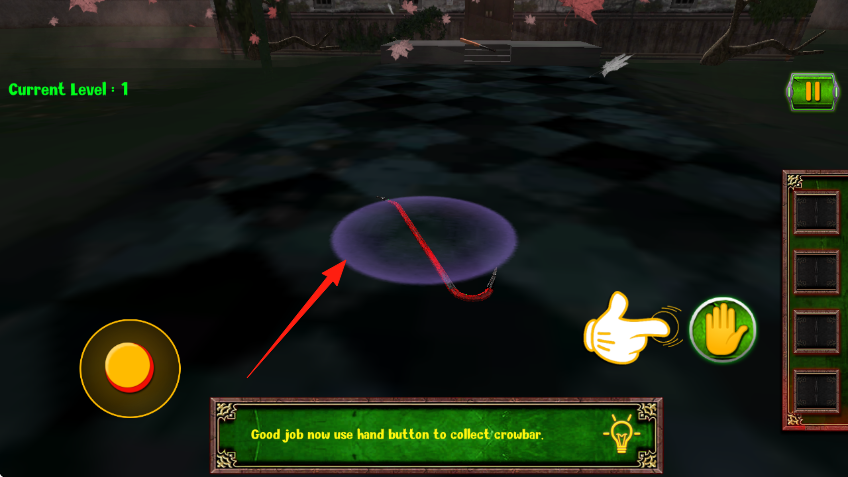 1、依據(jù)下方提示的語(yǔ)句,點(diǎn)擊右側(cè)手掌圖標(biāo),靠近紫色光圈處撬棍,完成收集。