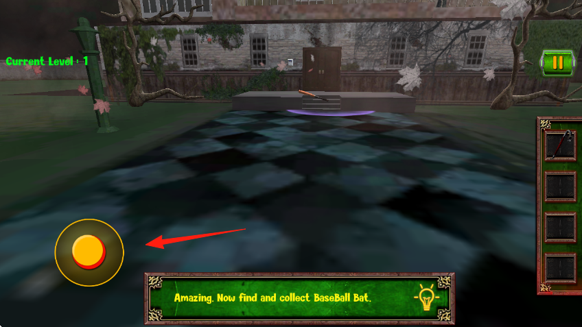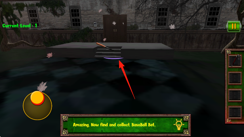 2、根據(jù)提示語(yǔ),角色需要操控左側(cè)的黃色搖桿移動(dòng),在場(chǎng)景里搜尋棒球棍。