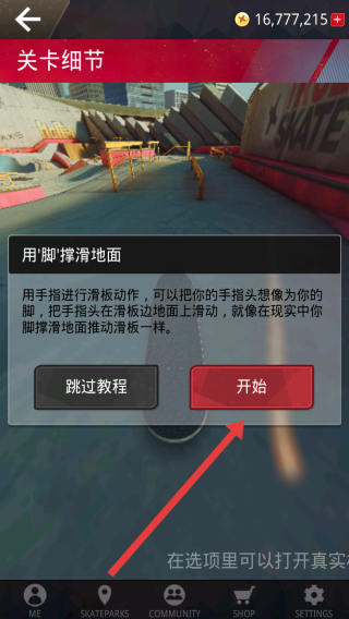 1、在關(guān)卡細(xì)節(jié)界面,點(diǎn)擊紅色開始按鈕,進(jìn)入教程,學(xué)習(xí)用手指模擬腳撐滑地面推動(dòng)滑板的操作,開啟滑板運(yùn)動(dòng)教學(xué)。