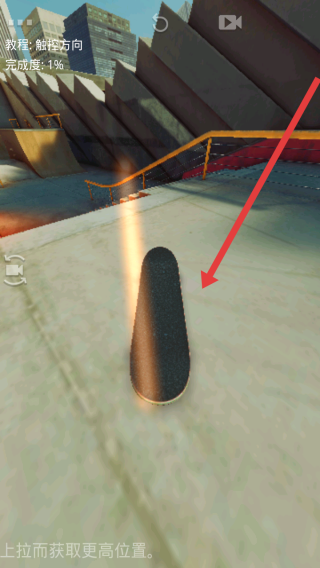 3、進(jìn)入觸控方向教程,向后滑動(dòng)屏幕使滑板前進(jìn),跟隨指引完成操作,推進(jìn)教程進(jìn)度,掌握滑板前行的基礎(chǔ)技巧。