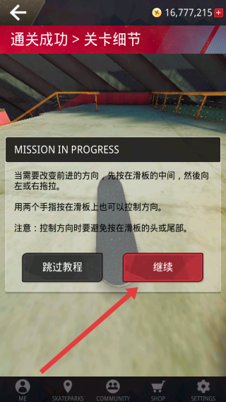 2、完成第一步教程后,點(diǎn)擊繼續(xù)按鈕,學(xué)習(xí)改變滑板方向的方法,可按滑板中間左右拖拉或兩指操控,避免按壓板頭尾。
