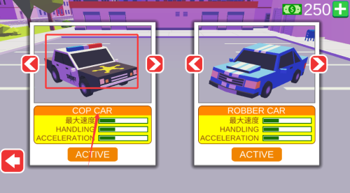 2、車庫中陳列警車與跑車兩類車型,根據(jù)任務(wù)需求選擇追擊或逃亡專用座駕。