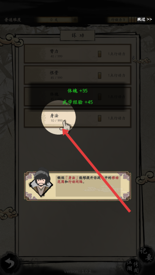 1、進入練功情節(jié)的界面,優(yōu)先分配行動力到身法等屬性,提升戰(zhàn)斗移動優(yōu)勢,消耗行動力升級。