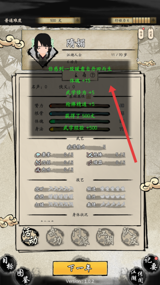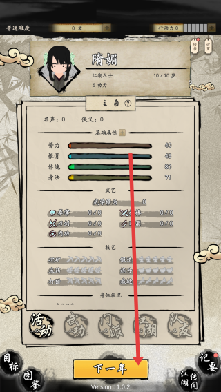 2、在角色的界面里,關(guān)注隋媚屬性的成長,每年結(jié)束點下一年推進時間,些許解鎖戰(zhàn)斗的技能。