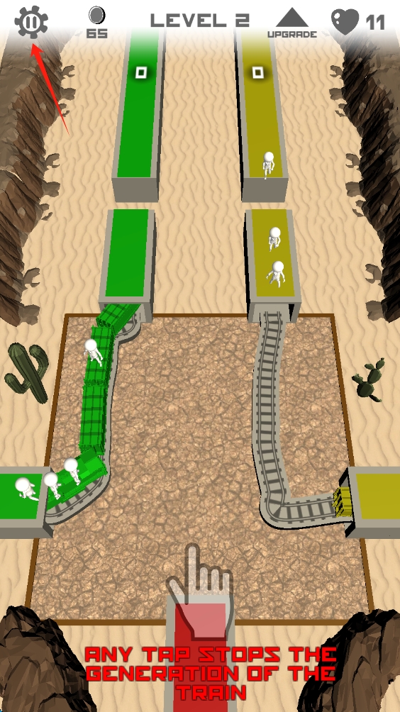 3、在第二關(guān)界面,可點(diǎn)擊左上角設(shè)置按鈕調(diào)整游戲設(shè)置,根據(jù)提示操作,精準(zhǔn)控制火車(chē),高效運(yùn)輸小人。