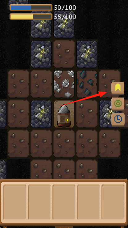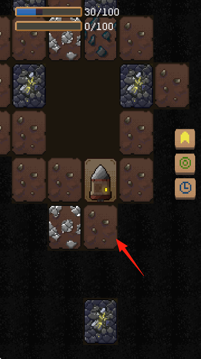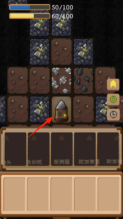2、角色在挖掘的過程中,點(diǎn)擊右側(cè)功能按鈕,使用對應(yīng)道具,輔助挖礦機(jī)移動、探測或加速挖掘。