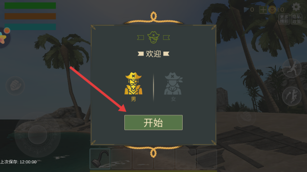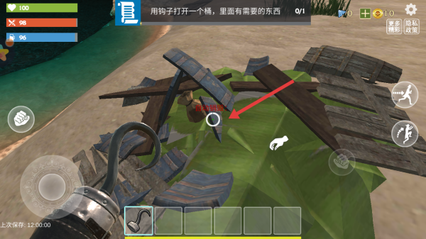 1、選擇性別后點(diǎn)擊開(kāi)始,進(jìn)入生存游戲,出生在海島場(chǎng)景,按指引用鉤子開(kāi)桶獲取物資,推進(jìn)初始任務(wù)。