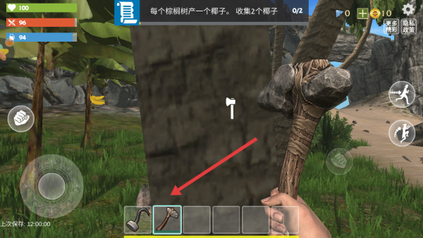 2、完成開(kāi)桶任務(wù)后,切換石斧工具,尋找棕櫚樹(shù),砍伐收集椰子,達(dá)成收集2個(gè)椰子的新任務(wù)目標(biāo)。
