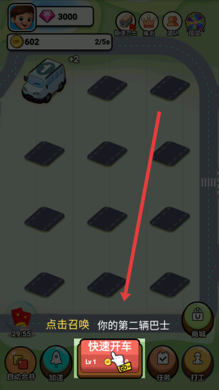 2、在停車場(chǎng)界面,可點(diǎn)擊底部快速開(kāi)車Lv1消耗10金幣賺取收益,也可等召喚CD29:55結(jié)束,點(diǎn)擊召喚獲取第二輛巴士,壯大車隊(duì)陣容。