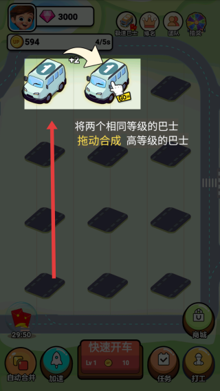 3、當(dāng)出現(xiàn)兩輛同等級(jí)巴士時(shí),拖動(dòng)它們至同一位置合成高等級(jí)巴士,提升車隊(duì)實(shí)力,同時(shí)留意金幣與鉆石積累,為巴士升級(jí)和擴(kuò)張儲(chǔ)備資源。