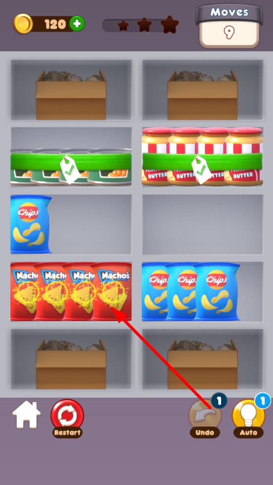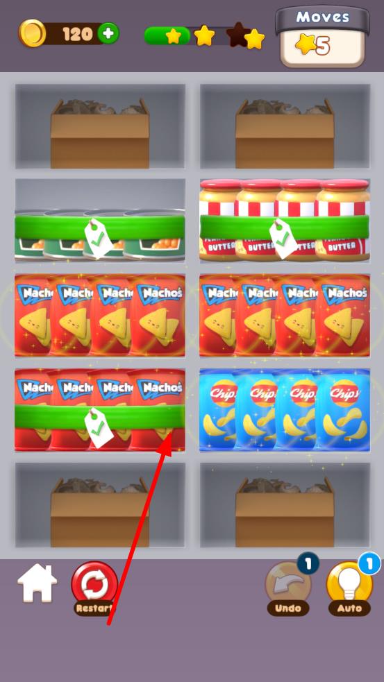 2、整理好的商品會(huì)自動(dòng)捆好,玩家可以專(zhuān)注于還沒(méi)有被消除的商品,需緊盯剩余步數(shù),優(yōu)先合并易消除的組合,從而應(yīng)對(duì)復(fù)雜布局。