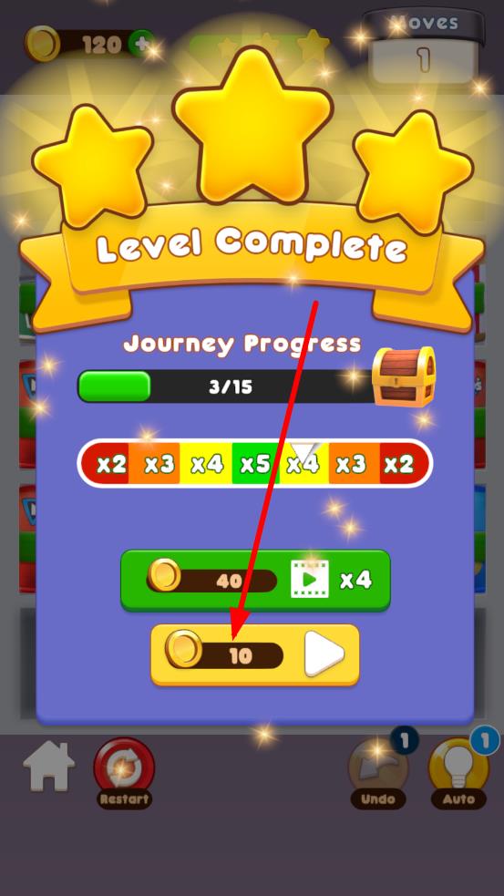 2、步數(shù)挑戰(zhàn):每關(guān)步數(shù)嚴(yán)格限制,剩余步數(shù)可轉(zhuǎn)化為額外金幣,激勵(lì)玩家壓縮無(wú)效移動(dòng),更注重精準(zhǔn)計(jì)算步驟,大幅提升關(guān)卡的挑戰(zhàn)性。