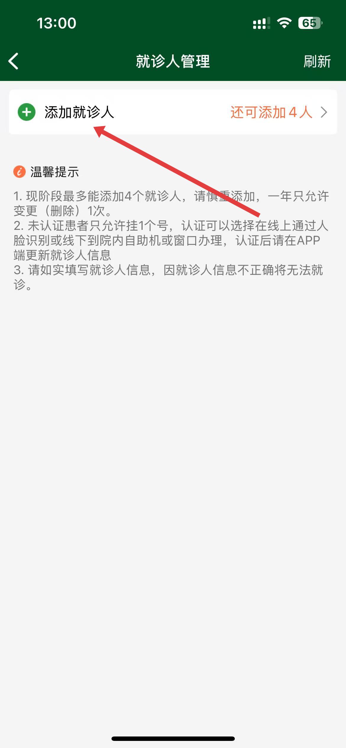 3、在就診人管理頁面,點(diǎn)擊添加就診人按鈕。
