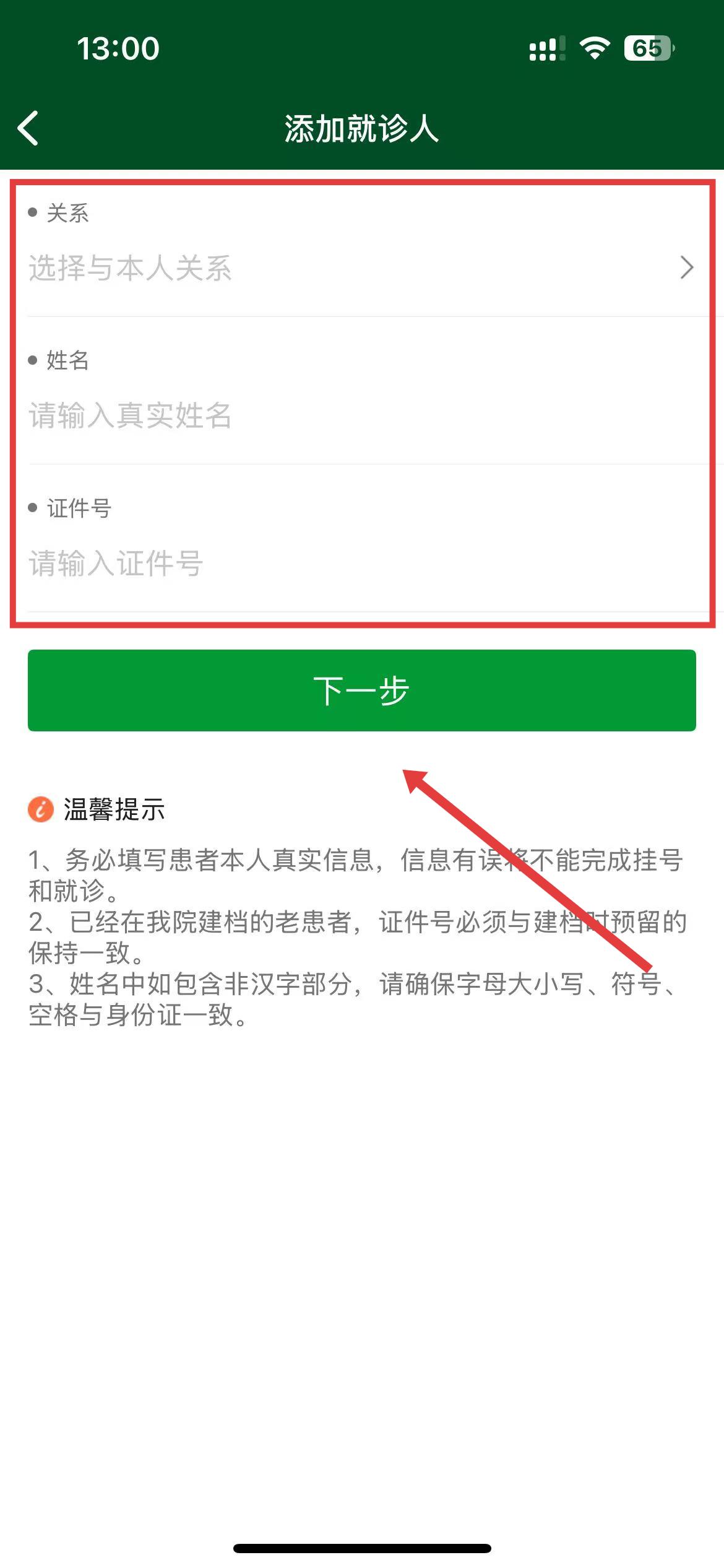 4、在添加就診人頁面,依次填寫與就診人的關(guān)系、就診人真實(shí)姓名、證件號(hào),確認(rèn)信息無誤后點(diǎn)擊下一步完成添加。