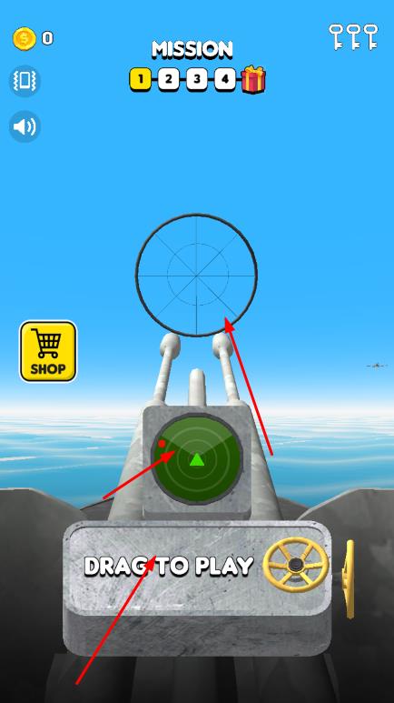 1、進(jìn)入游戲,在初始界面,根據(jù)提示拖動(dòng)開始游戲,在場景中,拖動(dòng)屏幕上的瞄準(zhǔn)器,調(diào)整防空機(jī)槍的射擊方向,瞄準(zhǔn)空中的目標(biāo)。