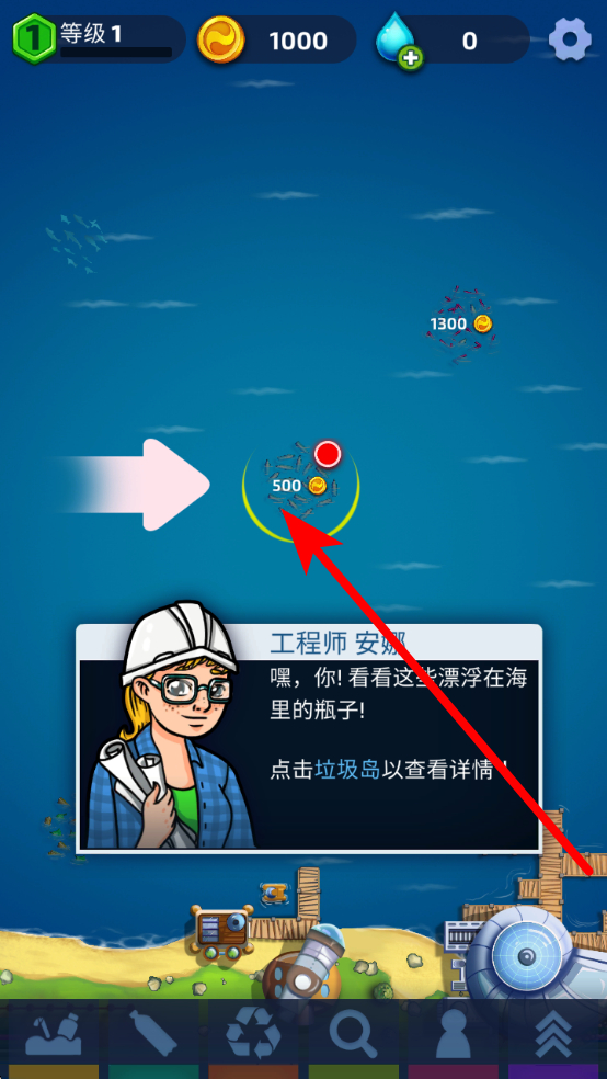 1、進入游戲后,像圖中這類有提示的垃圾島,點擊它查看詳情,了解可收集垃圾種類和數量,開展海洋清潔工作的重要一步,為后續(xù)收集和處理垃圾奠定基礎。