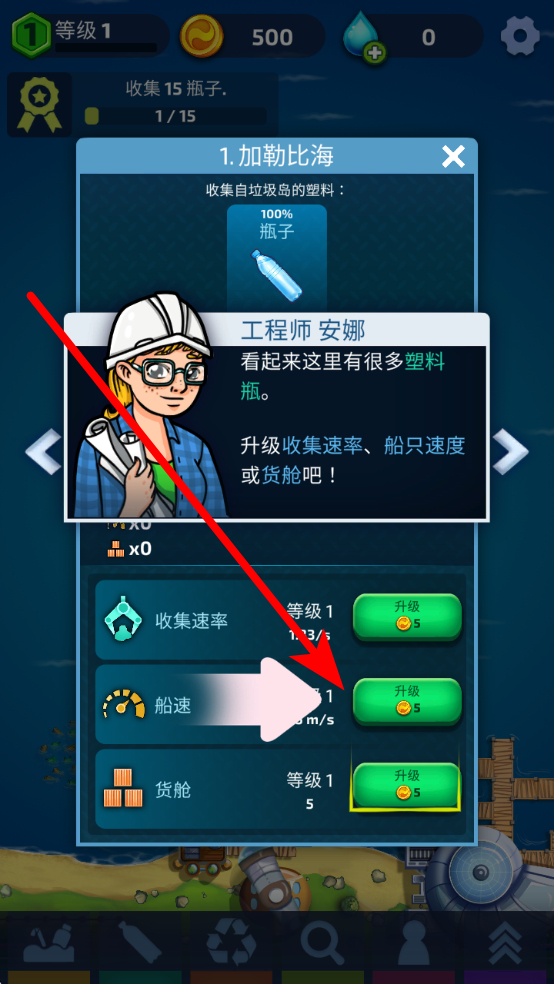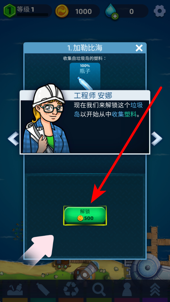 2、當遇到可解鎖的垃圾島時,如擁有足夠金幣,就點擊解鎖按鈕,解鎖后便能開始從中收集塑料等垃圾資源,擴大海洋清潔的范圍和規(guī)模,推進環(huán)保進程。