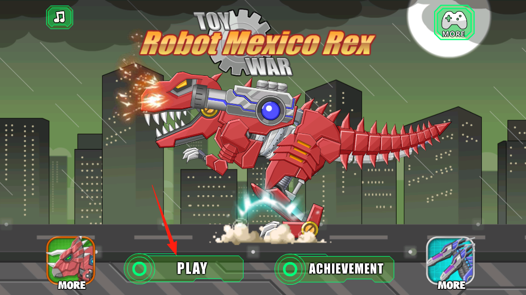 1、進入組裝機械霸王龍游戲界面,看到帥氣機械恐龍,點PLAY按鈕開始,之后操控機械恐龍在城市里戰(zhàn)斗,用它的武器技能揍敵人,守護城市。