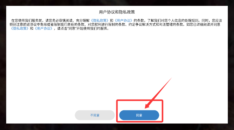 1、初次啟動時,仔細瀏覽服務(wù)條款,點擊"確認"鍵正式進入游戲世界。
