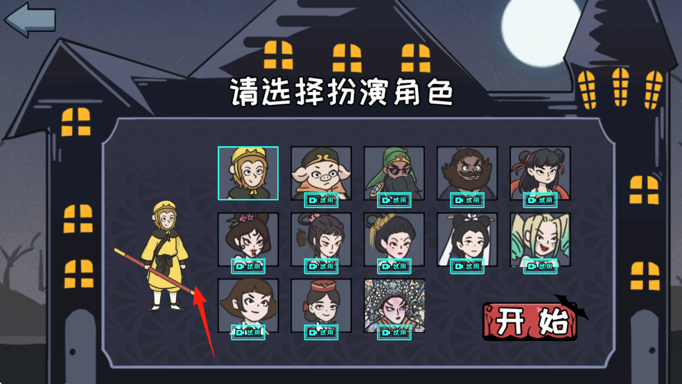 1、角色選擇界面,可選孫悟空等經(jīng)典角色,點擊試用體驗,選好后點開始進(jìn)入游戲。