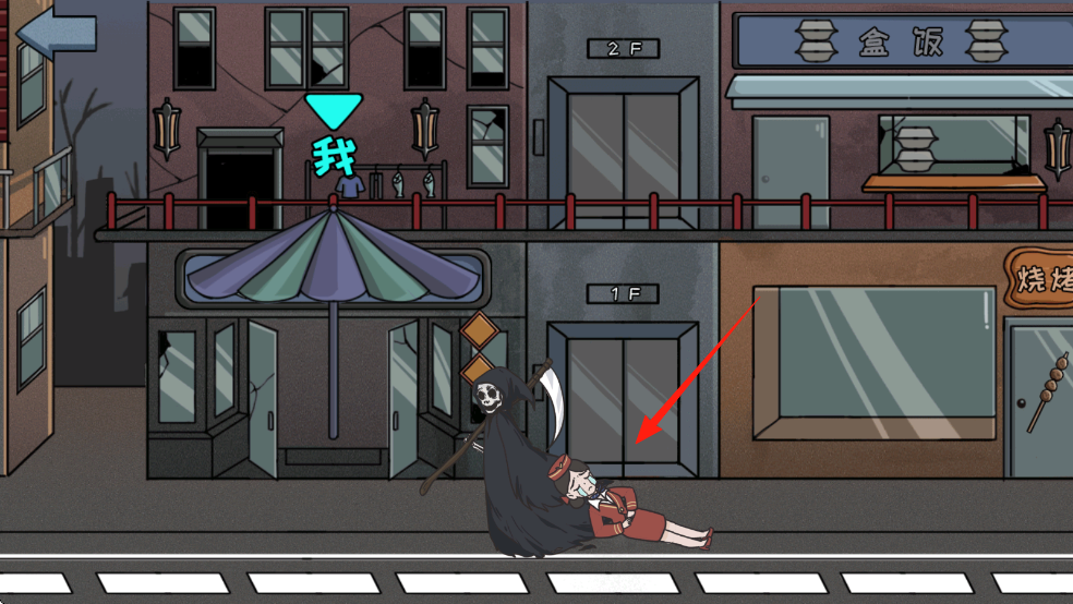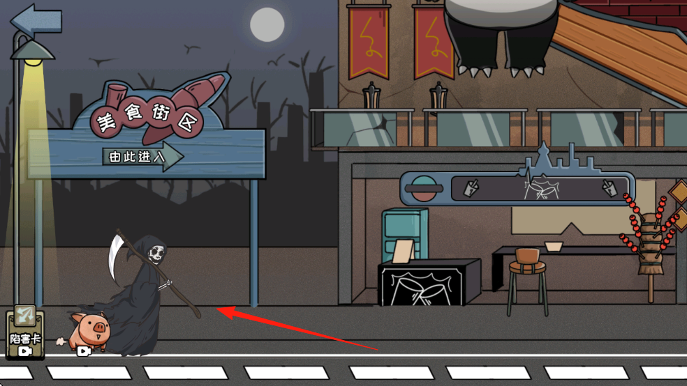 2、進(jìn)入美食街區(qū)場景,操控角色如死神帶小豬形象,沿箭頭指引探索,留意場景互動點。
