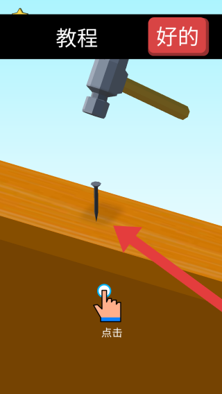2、目前處于教程的頁面,新手玩家可以先跟著教程進(jìn)行游玩,遇到釘子時(shí)需要馬上點(diǎn)擊錘子。