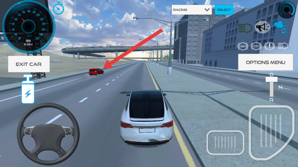 2、需要通過方向盤/虛擬按鍵來進(jìn)行操控方向,加速追擊前方紅色目標(biāo)的車輛,模擬競(jìng)速對(duì)抗。