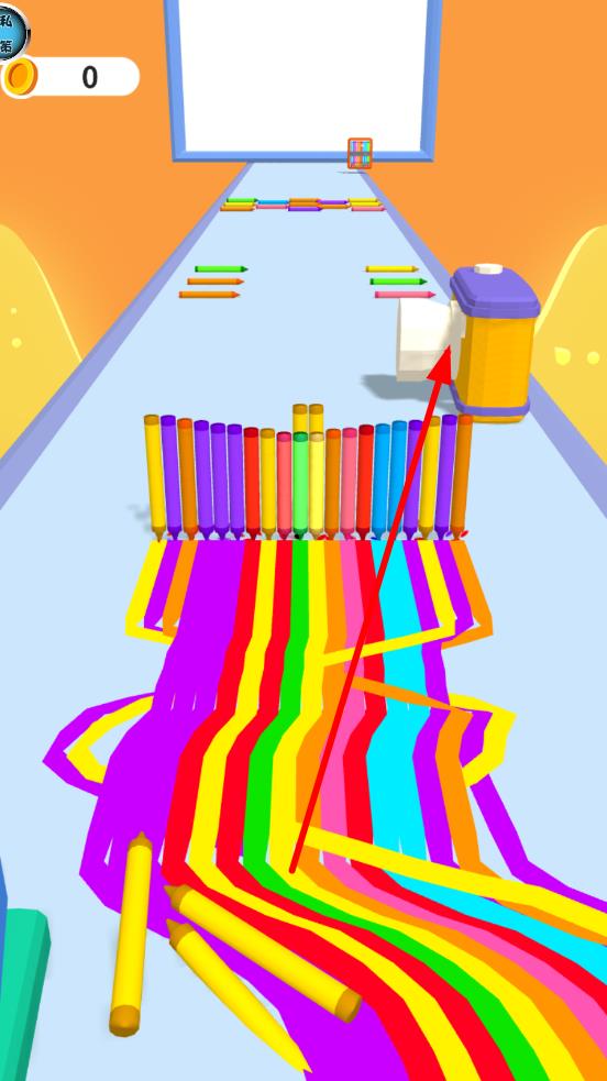 1、進入關卡,操控彩筆隊列沿跑道前進,滑動彩筆,靠近散落彩筆收集顏料,留意前方畫板空白區(qū)域提示,規(guī)劃收集路線。