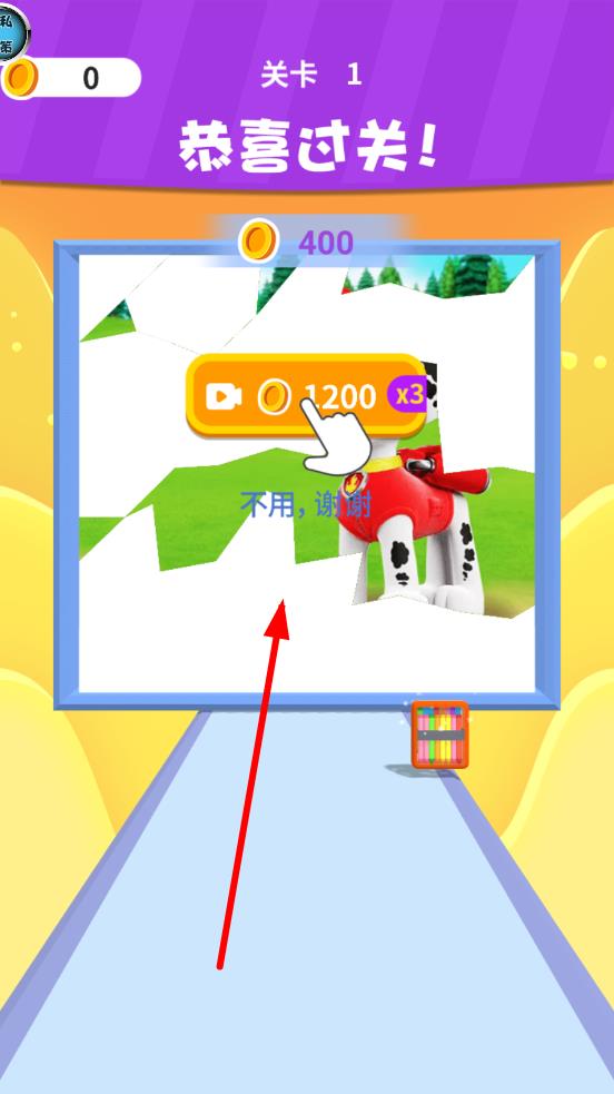 3、將所有的彩筆都使用繪制后,屏幕彈出通關獎勵,可選擇領取基礎金幣或觀看廣告獲取三倍收益,點擊下一關,解鎖更復雜的跑道機關。