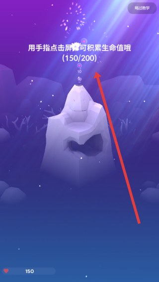 1、游戲初始,按提示用手指點(diǎn)擊屏幕,為石頭積累生命值,助力其從150向200成長,推進(jìn)養(yǎng)成進(jìn)程。