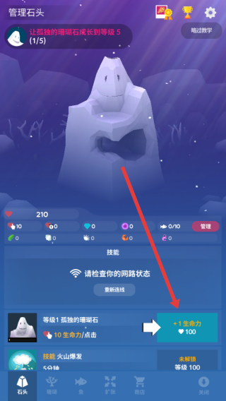 3、在管理石頭界面,點(diǎn)擊+1生命力按鈕,消耗資源提升石頭的生命力屬性,助力完成成長任務(wù)。