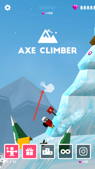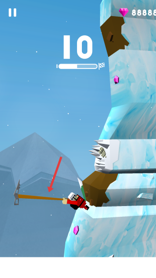 1、在Axe Climber游戲中點(diǎn)擊屏幕,控制角色使用斧頭攀爬冰山,在攀爬過程中收集鉆石等物品。