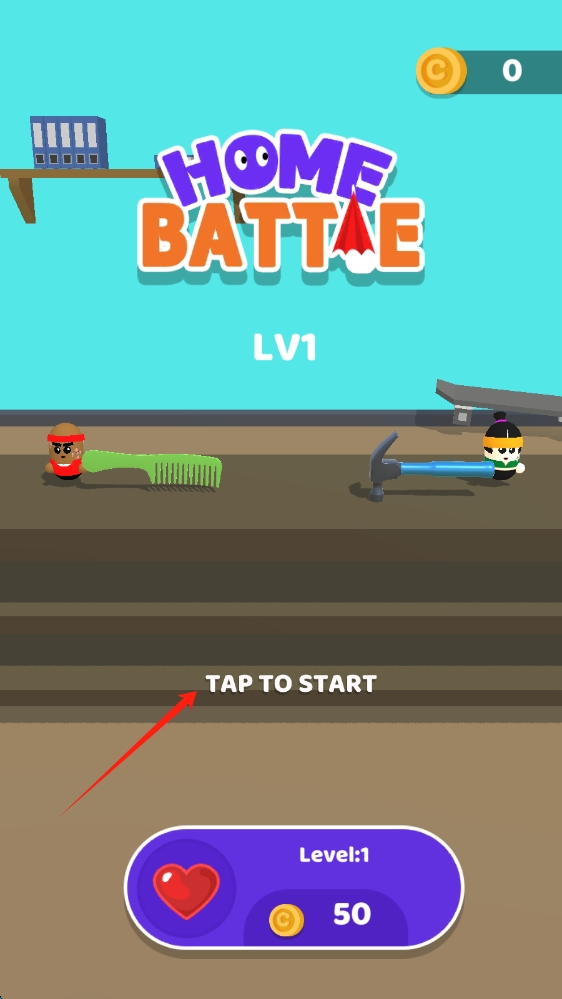 1、點(diǎn)擊TAP-TO-START,開(kāi)啟Home-Battle第一關(guān)的戰(zhàn)斗挑戰(zhàn),留意當(dāng)前金幣數(shù)量和生命值,合理規(guī)劃戰(zhàn)斗策略。