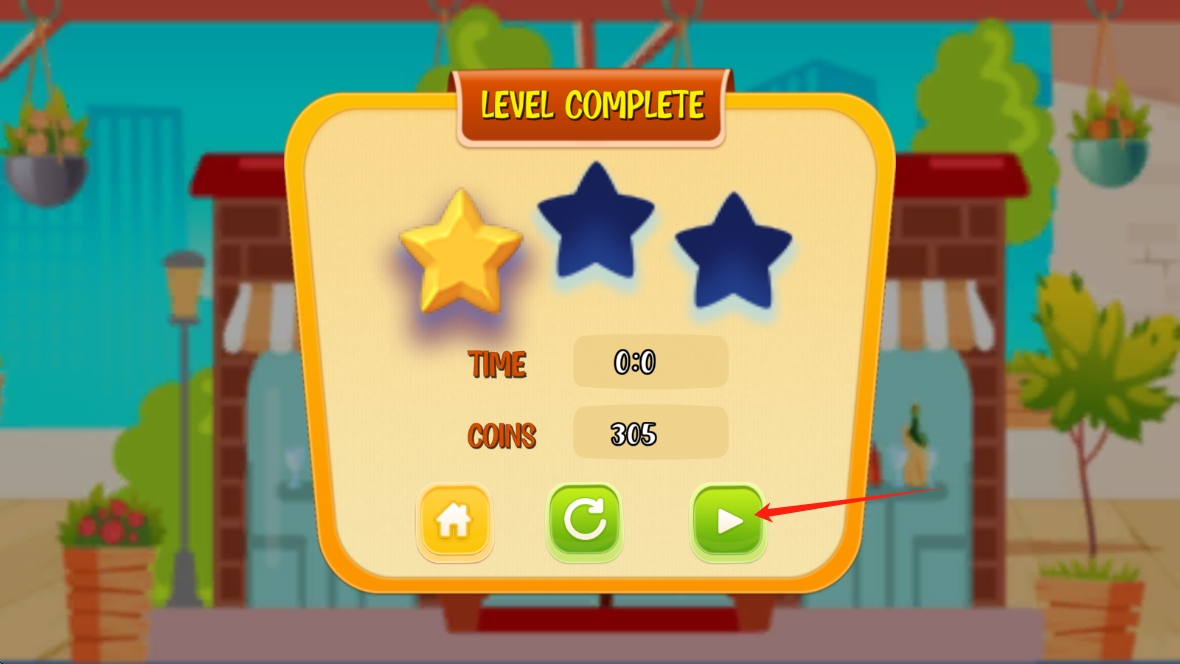 3、關(guān)卡完成后,根據(jù)獲得的金星評(píng)價(jià)、用時(shí)和金幣數(shù)量,總結(jié)經(jīng)驗(yàn),點(diǎn)擊綠色箭頭按鈕進(jìn)入下一關(guān)。