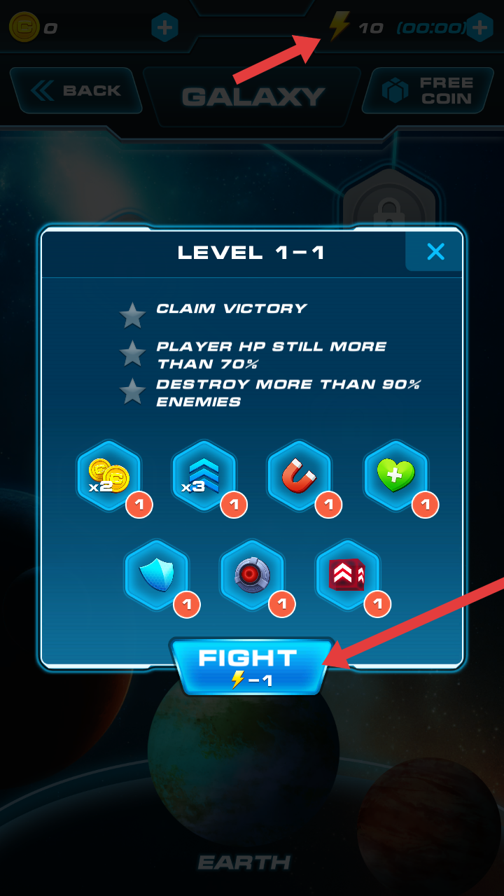 1、查看關(guān)卡的目標(biāo)后,需要點(diǎn)擊FIGHT消耗1點(diǎn)的閃電能量,正式開(kāi)啟LEVEL1-1的關(guān)卡挑戰(zhàn)。