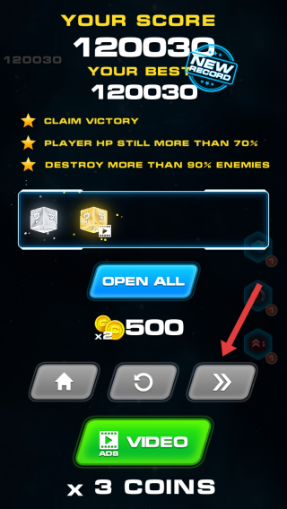 3、消滅全部的敵人則進(jìn)入關(guān)卡的結(jié)算界面,需要點(diǎn)擊右側(cè)箭頭的按鈕,開(kāi)始進(jìn)入下一關(guān)繼續(xù)冒險(xiǎn)。