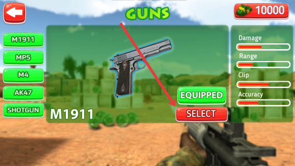 2、在武器界面選M1911手槍,可以通過點擊紅色SELECT按鈕,裝備后隨即進入射擊關(guān)卡。