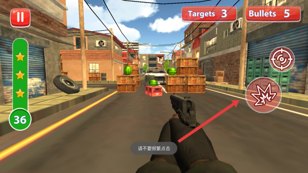 3、在游玩中需要瞄準西瓜目標,按照指示點擊右側(cè)射擊按鈕發(fā)射子彈,消滅指定數(shù)量目標推進關(guān)卡。