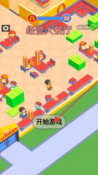 1、在經(jīng)營大餐廳游戲中,首先看到餐廳布局,點擊開始游戲按鈕,正式開啟餐廳經(jīng)營。