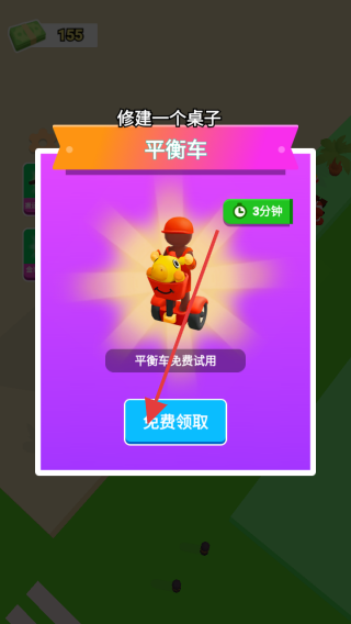 3、在游戲過程中,當出現(xiàn)修建一個桌子等任務(wù)時,可通過免費領(lǐng)取如平衡車等道具來助力完成任務(wù)。