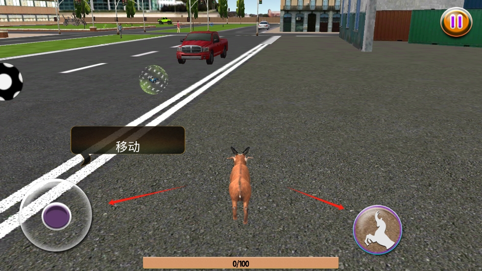 2、在商業(yè)區(qū)場景中我們用左側(cè)虛擬搖桿控制山羊移動(dòng),右側(cè)按鈕放技能,在街道撞汽車、球等物體,積累下方進(jìn)度。