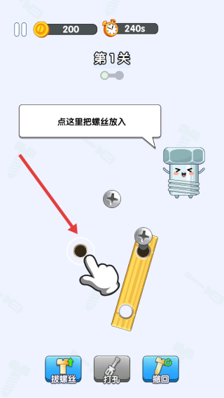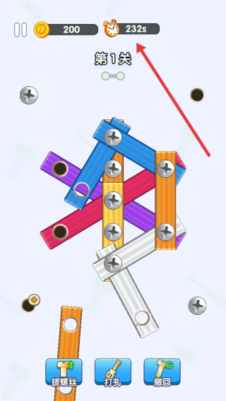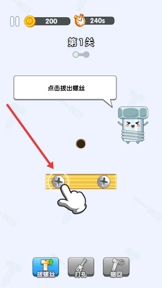 1、進(jìn)入關(guān)卡后,點擊拔螺絲工具,按指引點擊木板上螺絲,將其拔出,注意操作時限與金幣數(shù)量。