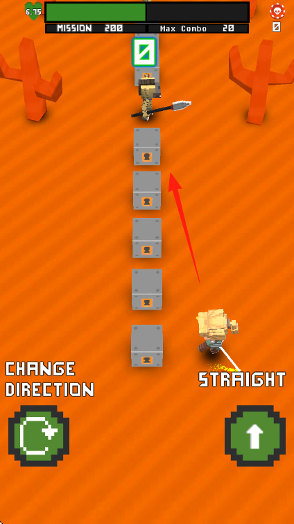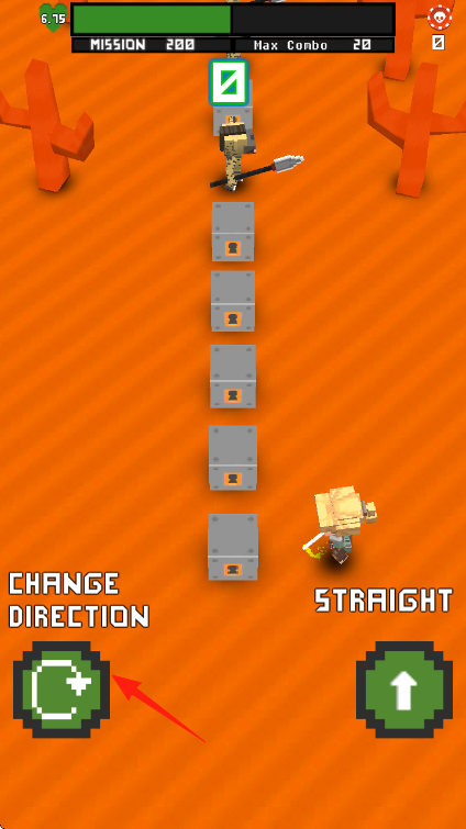 1、操控角色持武器小人,在橙色場景前進,遇到敵人,可按CHANGEDIRECTION改變方向或STRAIGHT直行按鈕調(diào)整移動。