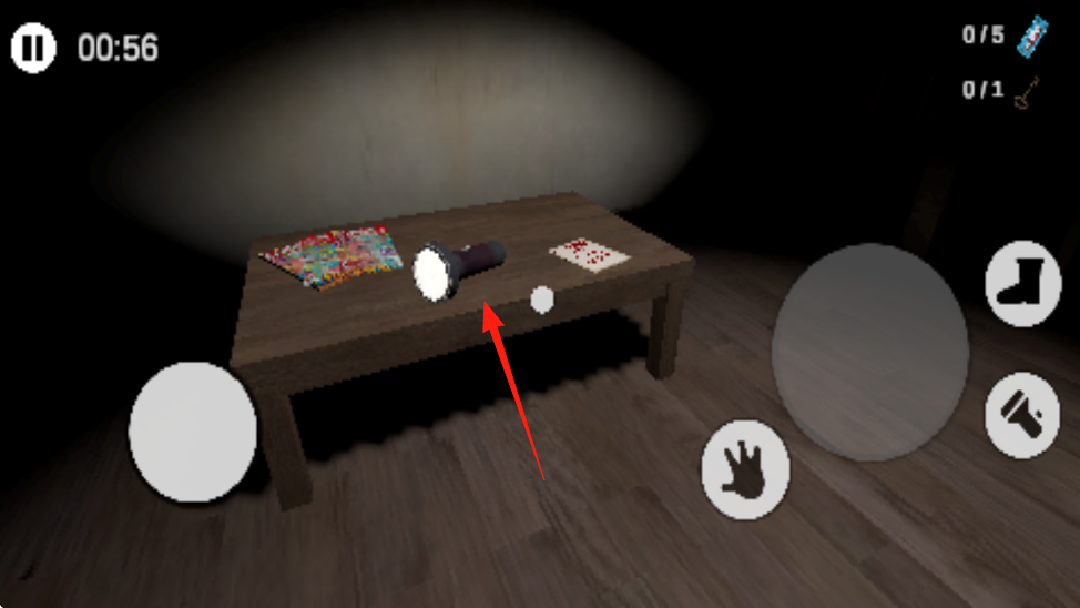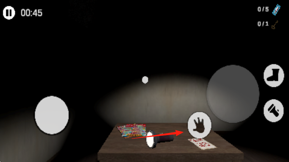 1、進(jìn)入游戲到黑暗場(chǎng)景中,操控角色,靠近桌子,點(diǎn)擊手圖標(biāo),收集物品手電筒、彩色物件等。