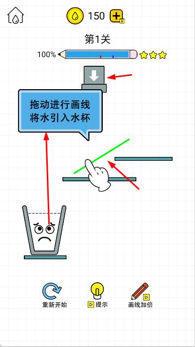 1、進入游戲,在關卡選擇界面,點擊關卡1,在場景中,根據提示拖動進行畫線,將水引入水杯 。