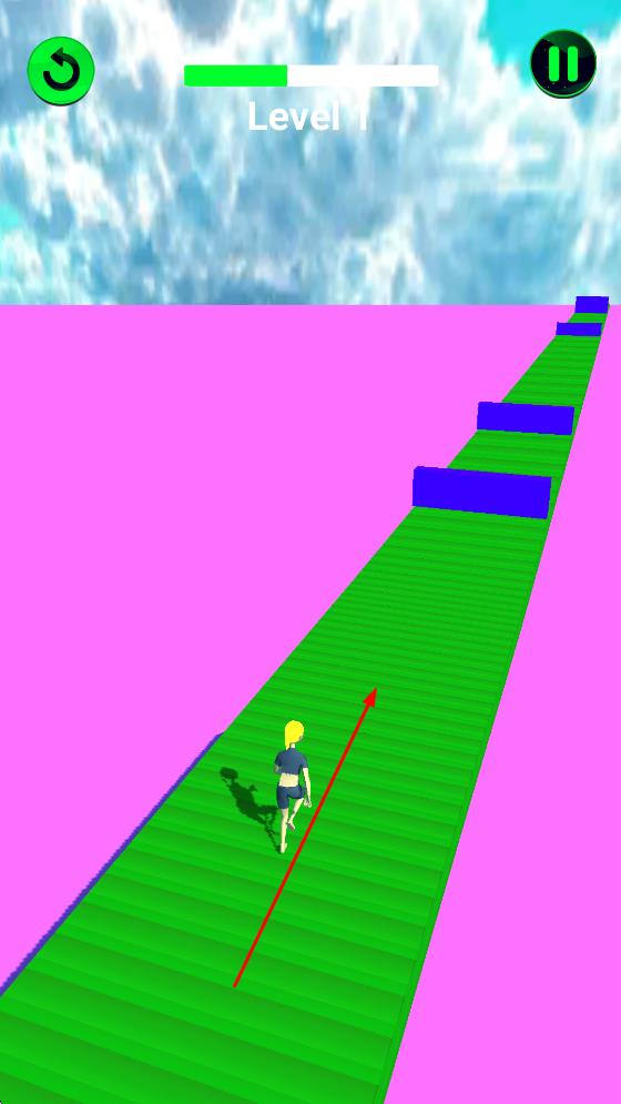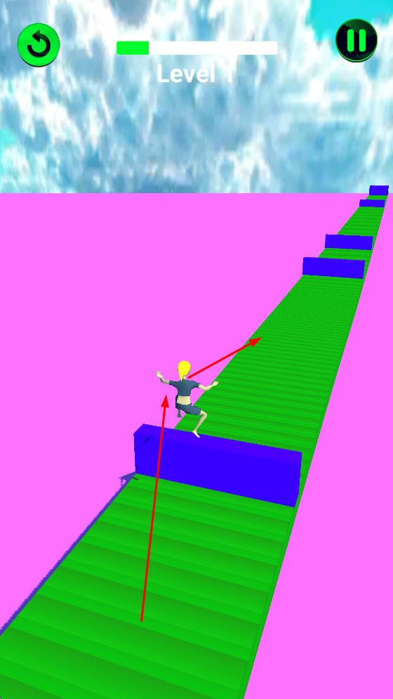 2、控制角色在綠色跑道前進(jìn),通過(guò)滑動(dòng)/點(diǎn)擊操作觸發(fā)跳躍,翻越藍(lán)色矩形障礙。